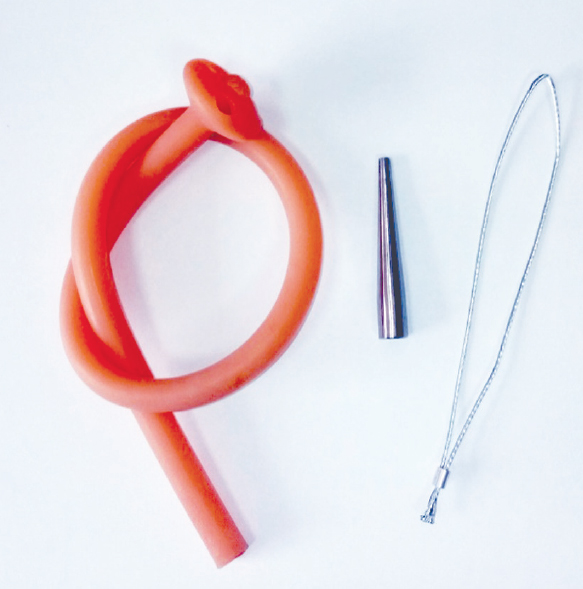 Использовали один импортный одноразовый набор для установки ЧЭГ с размером трубки 15 Fr (рис. 1). Кроме того, выполнена одна операция ЧЭГ с помощью многоразовых инструментов и катетера Пеццера 24 Fr и четыре операции с установкой катетера Пеццера 18 Fr с разработанным наконечником для проведения гастростомической трубки (патент RU № 2669483C1) (рис. 2).