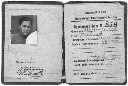 В середине 1944 г. Кутушев приезжает в ставший родным для него Ленинград, однако возвращение становится печальным: дом семьи не удалось сохранить. Подобная новость вынудила его перебраться на улицу Академика Лебедева, где была предоставлена комната. Желание стать врачом, возникшее задолго до войны, не давало покоя. Узнавшая о столь благородном стремлении Феттяха Халимовича соседка посоветовала ему обратиться в Ленинградский педиатрический медицинский институт. Он записался на прием к ректору института Юлии Ароновне Менделевой, которая после беседы с ним приняла решение о его зачислении [4], он был вторым молодым человеком на курсе, остальные — девушки. Так начался профессиональный путь будущего врача, который с ранних курсов увлекся делом своей жизни — хирургией (рис. 7). Интерес к этой специальности в студенческие годы был столь ярко выражен, что к концу обучения молодому хирургу позволяли самостоятельно выполнять незначительные оперативные вмешательства, а после окончания института Ф.Х. Кутушев был зачислен в клиническую ординатуру на кафедру детской хирургии по специальности «детская хирургия» (рис. 8).