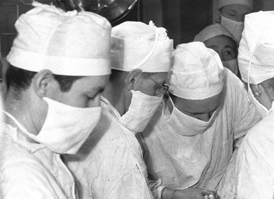 Fig. 11. Operator F.H. Kutushev (second from right) and assistant A.P. Kolesov (second from left) during open heart surgery, 1960