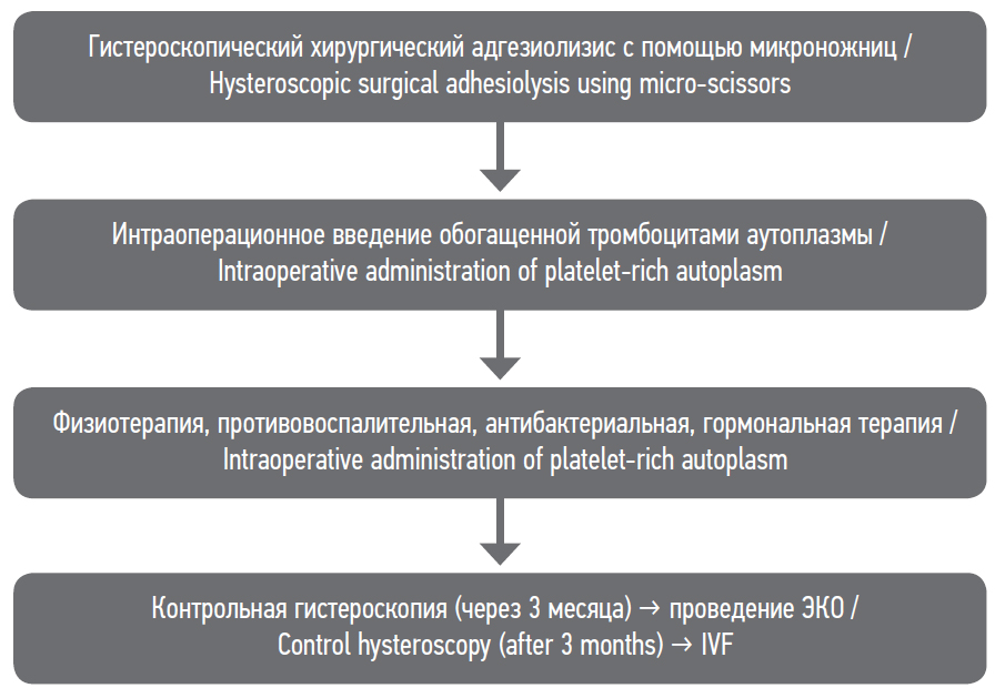 Рис. 1. Дизайн клинической апробации комплексного метода подготовки к экстракорпоральному оплодотворению пациенток с внутриматочными синехиями