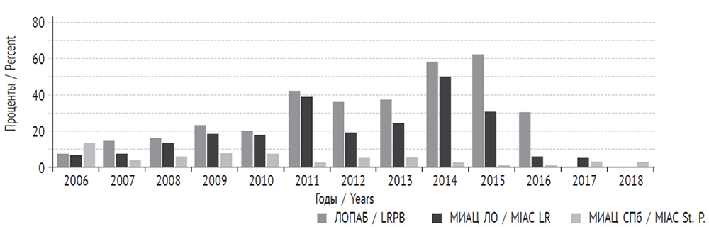 Fig. 1. The frequency of detection of intrauterine hypoxia and asphyxia as the cause of perinatal delivery of the fetus in 2006–2018. LRPB — Leningrad Regional Pathological Anatomical Bureau, MIAC St. P. and LR — Medical Information and Analytical Centers of St. Petersburg and the Leningrad Region