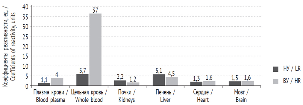 Рисунок. Коэффициенты реактивности на тепловое воздействие экспрессии гипоксия-индуцибельного фактора HIF-1α в разных тканях в группах высоко- и низкоустойчивых животных (ВУ и НУ соответственно)