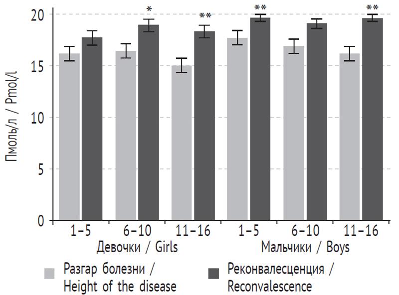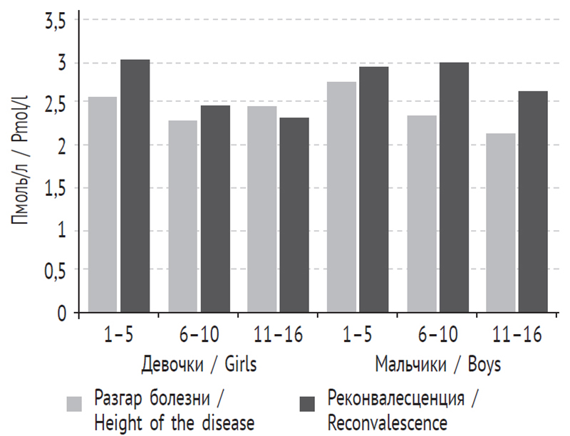 У мальчиков в группах от 6 до 10 лет и от 11 до 16 лет различие было достоверно (статистика знаковых рангов Уилкоксона в группе от 6 до 10 лет Z = –2,201, в группе от 11 до 16 лет — Z = –2,366), в группе от 1 до 5 лет достоверного различия установить не удалось, тем не менее выявлена значительная тенденция к снижению концентрации Т3 в период разгара болезни (рис. 1).