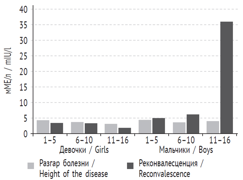 У мальчиков в возрастной группе от 6 до 10 лет различие было достоверно (статистика знаковых рангов Уилкоксона Z = –2,221), в группах от 1 до 5 лет и от 11 до 16 лет достоверного различия установить не удалось, тем не менее выявлена определенная тенденция к снижению концентрации ТТГ в период разгара болезни.