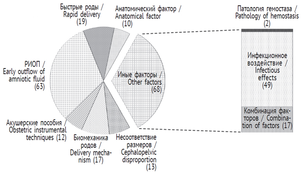 Согласно анамнестическим данным, отсутствие гидравлического защитного фактора для головки плода в результате раннего излития околоплодных вод наблюдалось у 47 % (63) рожениц. Повышение маточно-атмосферного градиента по причине быстрых или стремительных родов среди первородящих отмечалось в 14,1 % (19) случаев. Средние показатели продолжительности I и II периода родов у повторнородящих существенно не отличались от нормальных физиологических величин. Влияние анатомического фактора, вызванного аномальным строением пуповины и ее обвитием, отмечено у 7,4 % (10) новорожденных.