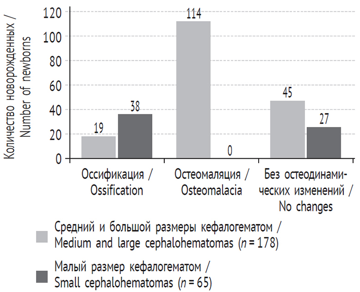 RESULTS: The predominance of children with the presence of cephalohematomas with a history of the absence of hydraulic protection of the head due to early rupture of amniotic fluid was revealed in relation to other mechanical factors of intranatal damage. The greatest number of subperiosteal hemorrhages was noted in newborns from multiparous mothers. The main non-traumatic factor contributing to the formation of cephalohematomas was the factor of infectious effect on the fetus. The predominance of osteomalacic processes with medium and large volumes of cephalohematomas in relation to small-sized cephalohematomas, which had a tendency to early ossification, was noted. The effectiveness of therapeutic aspiration was noted in all cases of observation of newborns from the surgical subgroup.