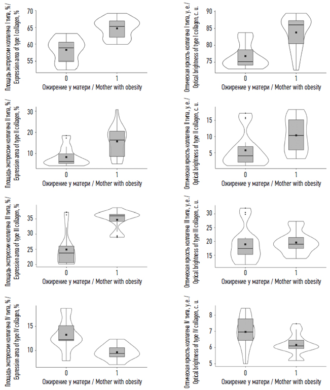 MATERIALS AND METHODS: A histological examination of the placentas of obese women (18 patients) and the ones with a normal body mass index (18 patients) who gave birth to mature newborns at the Perinatal Center of St. Petersburg State Medical University from 2018 to 2021 was performed followed by immunohistochemical examination. Staining of placenta specimens was carried out in accordance with the standard immunohistochemical protocol, using primary antibodies to type I–IV collagen.