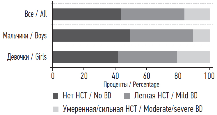 Силуэт, отличный от фактического, хотели иметь 139 (57 %) подростков — 93 (59,2 %) девочки и 46 (52,9 %) мальчиков. Легкую НСТ испытывали 97 (39,8 %) подростков, умеренную и сильную — 42 (17,2 %), без статистически значимых различий по полу (рис. 1).