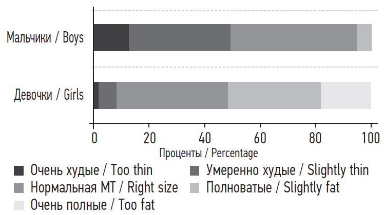 Исследования предшествующих лет показали, что подростки с избыточной МТ/ожирением наиболее предрасположены к развитию НСТ [20]. Вместе с тем есть свидетельства того, что НСТ свойственна и подросткам с нормальной МТ. В одном из исследований 90,5 % подростков, неудовлетворенных из-за худобы, и 55,2 % подростков, неудовлетворенных из-за избыточной МТ, имели нормальный вес [24].