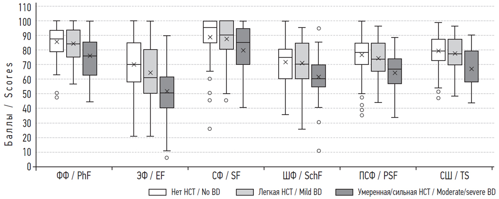 Рис. 4. Связанное со здоровьем качество жизни у подростков без неудовлетворенности собственным телом (НСТ) и с разной степенью неудовлетворенности собственным телом (25-й и 75-й квартили, мин – макс). × — среднее арифметическое; «–» медианы; «◦» — выбросы; ФФ — физическое функционирование; ЭФ — эмоциональное функционирование; СФ — социальное функционирование; ШФ — школьное функционирование; ПСФ — психосоциальное функционирование; СШ — суммарная шкала
