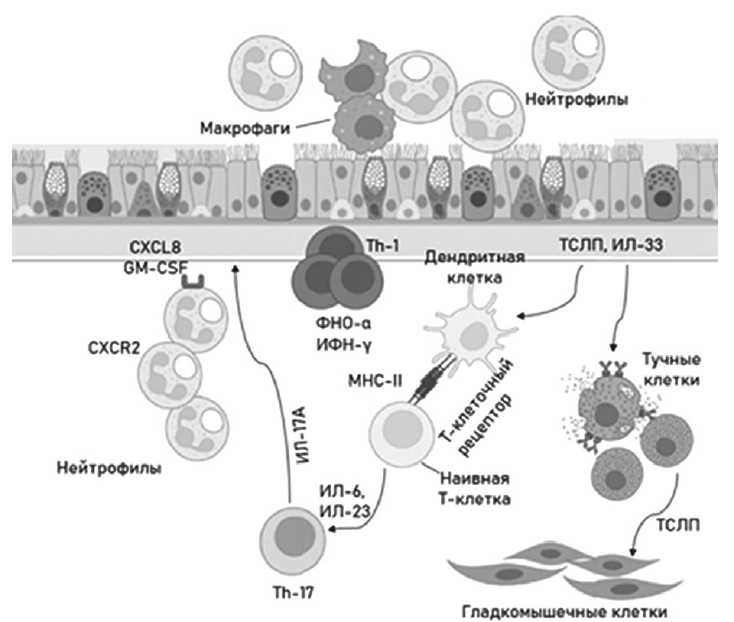 Рисунок. Предполагаемый механизм развития астмы с низким уровнем Т2-воспаления [27]. ИЛ — интерлейкин, ИФН — интерферон, Th — Т-хелпер, ТСЛП — тимусный стромальный лимфопоэтин, ФНО — фактор некроза опухоли, CXCL8 — интерлейкин 8, CXCR2 — бета-рецептор интерлейкина 8, MCH — главный комплекс гистосовместимости, GM-CSF — гранулоцитарно-макрофагальный колониестимулирующий фактор