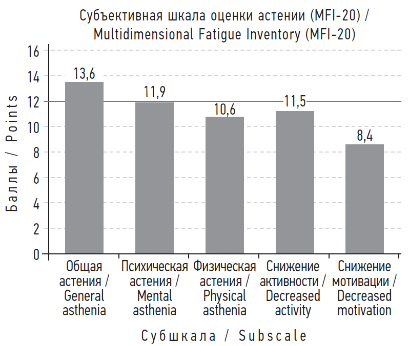 Рис. 1. Показатели астении у пациентов, перенесших новую коронавирусную инфекцию средней или легкой степени тяжести не больше чем полгода назад от момента проведения исследования (n = 50)