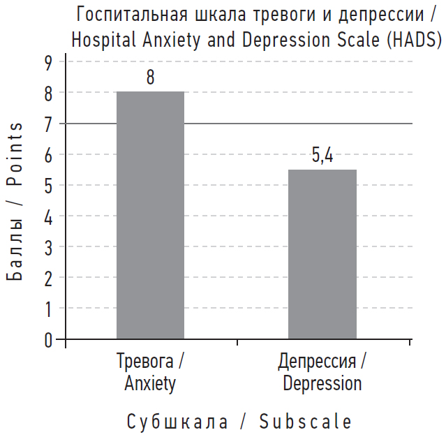 Рис. 2. Показатели тревоги и депрессии у пациентов, перенесших новую коронавирусную инфекцию средней или легкой степени тяжести не больше чем полгода назад от момента проведения исследования (n = 50)