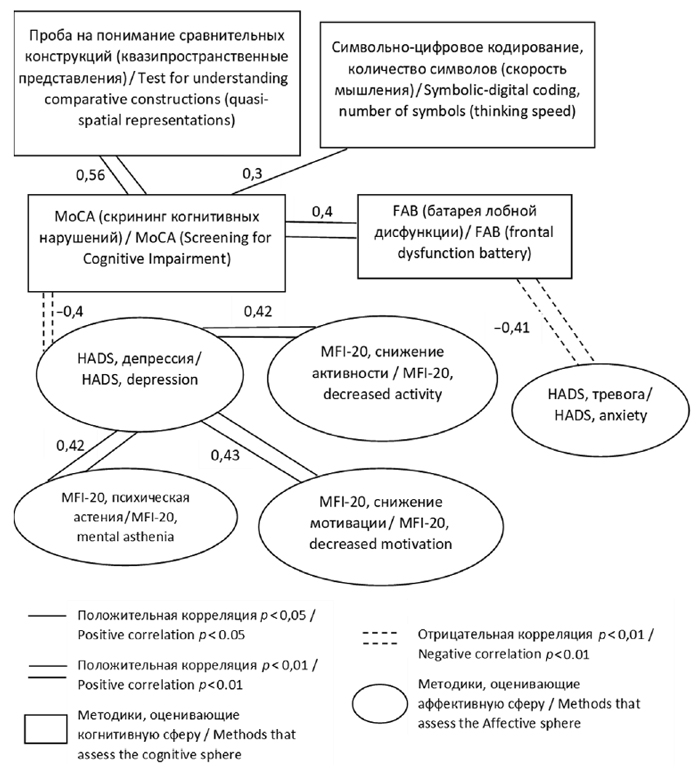 Fig. 3. Correlations of indicators of methods assessing the cognitive sphere (Montreal scale for assessing cognitive functions MoCA, frontal dysfunction battery FAB, test for understanding comparative structures, symbol-numeric coding test) with methods assessing the affective sphere (subjective asthenia scale MFI-20, hospital anxiety scale and depression HADS)