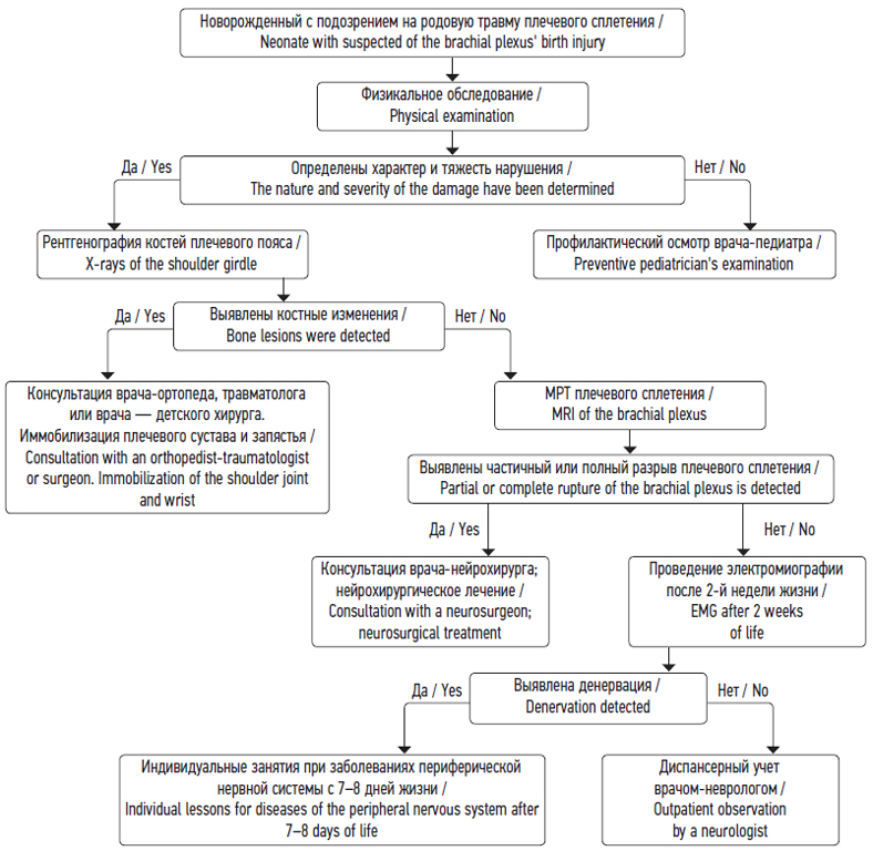 The article presents a draft of clinical recommendations for the diagnosis and treatment of Erb palsy in birth injury. These recommendations are intended for physicians of maternity hospitals and are aimed at providing information support for decision-making by a doctor in the event of a birth injury, as well as improving the quality of medical care to a patient. The recommendations correspond to the latest scientific data on the topic, and also contain information that is of an applied nature for practical activities. These practical recommendations are offered for public discussion and are posted in full on the website of the Ministry of Health of the Russian Federation. The recommendations contain an information note on Erb palsy in birth injury, including the definition, etiology and pathogenesis of the disease. Three types of classification of generic traumatic lesions of the brachial plexus are presented: by prevalence, by severity of nerve damage and by severity of paresis. The clinical features of the disease are considered in detail. To diagnose the disease, an algorithm of physical examination is proposed, and the use of instrumental research methods: MRI, ultrasonic, X-ray and electromyographic studies. Recommendations for the conservative treatment of pathology and the use of physiotherapy and rehabilitation techniques are given. An algorithm of the doctor’s actions and an information certificate about the disease are proposed to inform the patient’s parents. The recommendations are given taking into account the level of credibility of the recommendations and the level of reliability of the evidence.