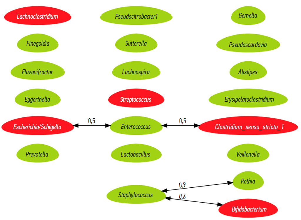 Fig. 2. Correlogram of relationships between bacterial genus isolated in 16S rRNA sequencing in the intestinal microbiome of girls in group 1. The dominant bacterial genus in the gut microbiome are shown in red color, based on their mean relative abundance in girls. The black solid directions indicate positive correlations, and the number above the arrow indicates the strength of the correlation