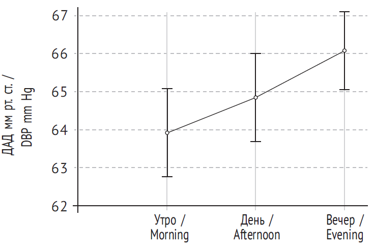 ДАД днем, мм рт. ст. / DBP afternoon, mm Hg | 64,8 | 4,0 | 57,9 | 76,0 | 62,1 | 67,9 |