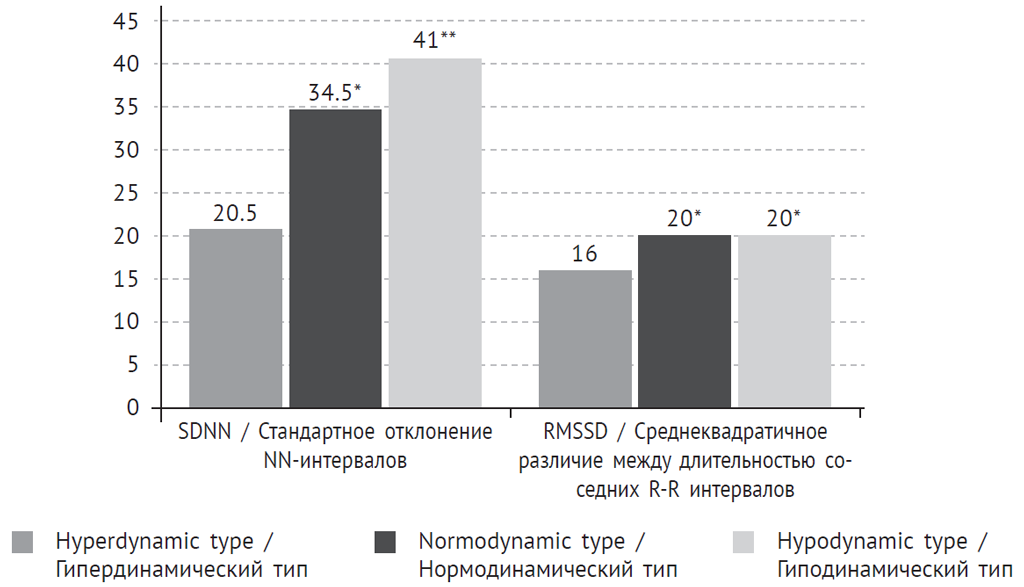 Fig. 1. Indicators of SDNN and RMSSD in patients with acute cerebrovascular accidents and different types of haemodynamics in the first days after vascular catastrophe. * – reliably when comparing indicators of the groups of hyperdynamic and normodynamic types of blood circulation, р < 0.05; ** – reliably when comparing indicators of the groups of hyperdynamic and hypodynamic types of blood circulation, р < 0.05