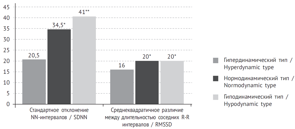 Fig. 1. Indicators of SDNN and RMSSD in patients with acute cerebrovascular accidents and different types of haemodynamics in the first days after vascular catastrophe. * – reliably when comparing indicators of the groups of hyperdynamic and normodynamic types of blood circulation, р < 0.05; ** – reliably when comparing indicators of the groups of hyperdynamic and hypodynamic types of blood circulation, р < 0.05