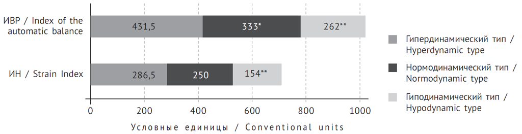 Fig. 2. Indicators of the autonomic balance and strain index in patients with acute cerebrovascular accidents and different types of haemodynamics in the first days after vascular catastrophe. * – reliably when comparing indicators of the groups of hyperdynamic and normodynamic types of blood circulation, р < 0.05; ** – reliably when comparing indicators of the groups of hyperdynamic and hypodynamic types of blood circulation, р < 0.05