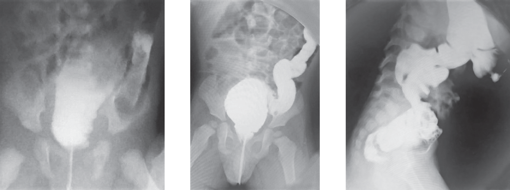 При ревизии брюшной полости выявлено расширение толстой кишки в нисходящем отделе до 8–9 см и сужение до 1,5 см в ректосигмоидном (рис. 3). Выполнена биопсия толстой кишки, наложена двойная колостома на нисходящий отдел. При гистологическом исследовании установлено отсутствие нервных ганглиев в ректосигмоидном отделе. В дальнейшем выполнена радикальная операция.