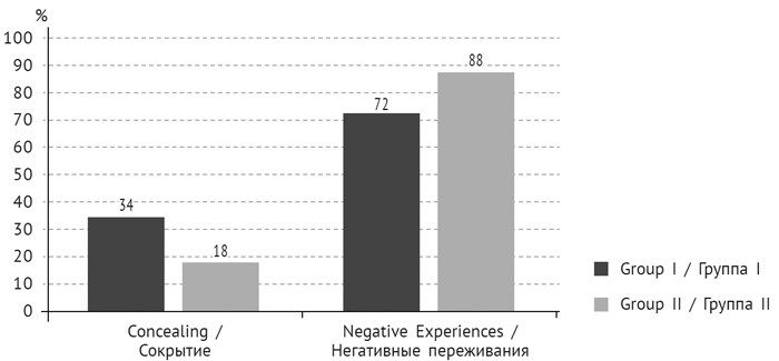 - Concealment of HIV status from a sexual partner. Between the main groups, differences were found in the percentage of cases of HIV status concealment (Figure), which was more often reported among injecting drug users, but the result was not statistically significant. At the same time, significant differences were found in the percentage of cases of negative experiences in revealing HIV status, and more pronounced negative feelings were noted in group 2 (φ = 2.02, p= 0.05).