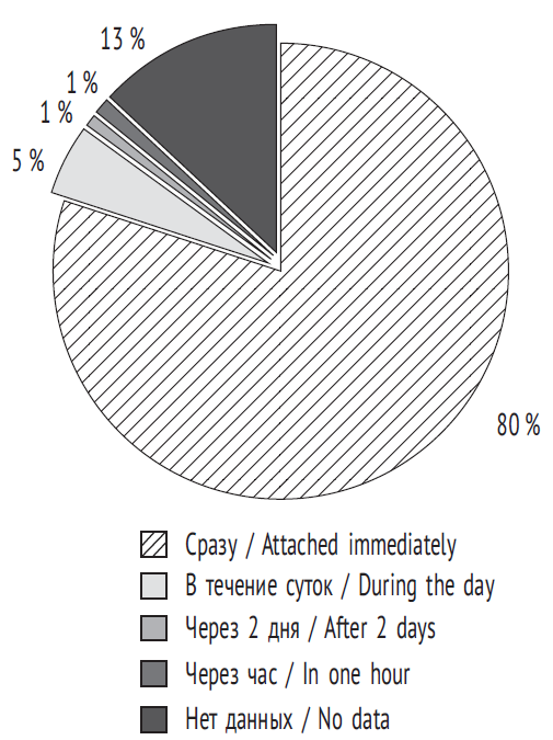 На основании анкетирования родильниц получены данные о времени первого прикладывания новорожденного к груди матери после рождения (рис. 1).