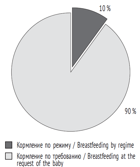 Анализ способа кормления новорожденных, находящихся в палатах совместного пребывания матери и ребенка в акушерском физиологическом отделении, показал, что 90 % женщин придерживаются принципа кормления ребенка «по требованию». Строго по режиму вскармливались 10 % детей, получавших докорм молочной смесью (рис. 2). Полученные данные свидетельствуют о соблюдении отечественных и мировых рекомендаций по питанию новорожденных в перинатальном центре [14, 27].