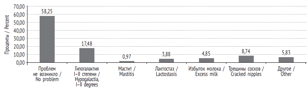 Трудности при грудном вскармливании выявлены у 41,7 % женщин (рис. 3). Самые распространенные проблемы — недостаток молока (17,48 %) и трещины сосков (8,74 %). Медицинские сестры отделения проводили инструктаж по технике сцеживания молока и способам поддержания лактации при временной невозможности кормления ребенка грудью. Индивидуально обучали правилам прикладывания ребенка к груди и профилактике развития повторных трещин сосков.