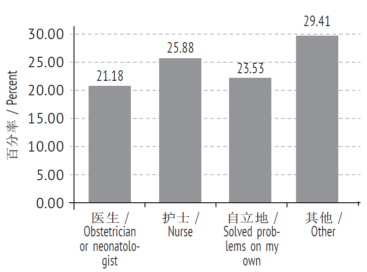 По данным анкетирования, источниками информации женщин по вопросам грудного вскармливания в 25,9 % случаев явились медицинские сестры и акушерки, и в 21,2 % — лечащие врачи — акушеры-гинекологи (рис. 4). В шкалу «другое» (29,4 %) вошли такие варианты ответов, как: советы дали родственники, использовали ресурсы сети Интернет. Самостоятельно решали возникшие проблемы 23,5 % родильниц (вторые и последующие роды). Наряду с внешними источниками информации, женщины опираются на внутреннюю убежденность в необходимости естественного вскармливания, то есть на выработанную в период планирования и/или период беременности доминанту лактации.