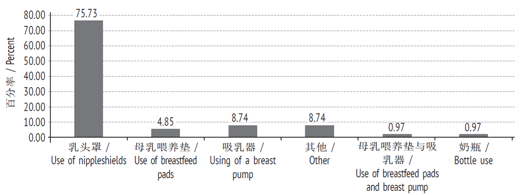По результатам анкетирования, все женщины, которые принимали участие в опросе, использовали одно или несколько приспособлений для кормления ребенка (рис. 5). Самыми распространенными оказались защитные накладки для груди (75,7 %), используемые при болезненных ощущениях во время кормления грудью либо при слабом сосательном рефлексе у ребенка. Вторым (8,7 %) по распространенности использования в отделении оказался молокоотсос для сцеживания грудного молока, позволяющий наладить процесс лактации, стимулировать выработку молока при его недостатке, и необходимый для создания запаса пищи (индивидуального банка молока) для ребенка.