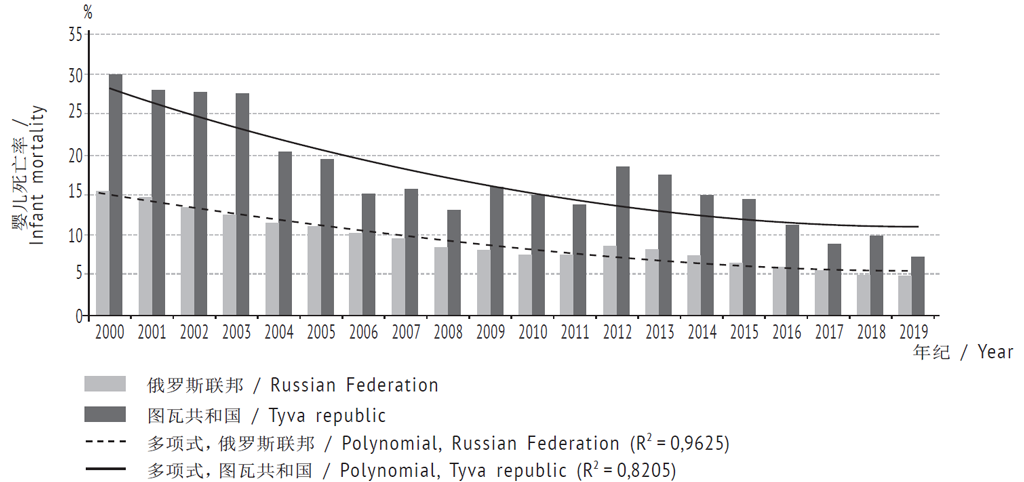 尽管在出生后第一年死亡的儿童人数逐渐下降,但共和国的婴儿死亡率远高于全国平均水平。使用多项式趋势对指标进行统计分析证实,在今后几年内,图瓦婴儿死亡率的下降极有可能继续下去,然而,共和国数据的近似系数(R2)为0.820,低于俄罗斯的平均值(0.962)。俄罗斯转为国际出生登记标准后,2012年婴儿死亡率上升(8.6‰),但2014年各项指标恢复到2011年的水平(7.4‰)。在图瓦,由于新生儿登记标准的改变,婴儿死亡率的增加更为明显(18.4‰),并延长:2011年指标值(13.7‰)仅在2016年实现。