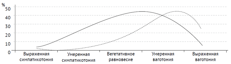 - Вегетативный тонус мигрантов и коренных жителей Крайнего Севера представлен пятью вариантами — с вегетативным равновесием, симпатикотонией, выраженной симпатикотонией, ваготонией и выраженной ваготонией.
