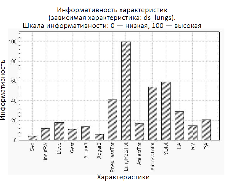Рис. 1. Информативность характеристик, использованных для классификации детей с поражением легких с выполнением рентгенографии и УЗ-исследования. Обозначения: sex — пол ребенка, insufPA — недостаточность клапана легочной артерии (экспертная оценка, 4 степени), days — день жизни в момент обследования, gest — срок гестации при рождении (недели), Apgar1 — оценка Апгар на 1-й минуте (баллы), Apgar2 — оценка Апгар на 5-й минуте (баллы), PneuLessTot — снижение пневматизации легочных полей на рентгенограмме (бинарная экспертная оценка), LungPatsTot — усиление легочного рисунка за счет интерстициального компонента, AtelectTot — уменьшение объема легких на рентгенограмме (бинарная экспертная оценка), AirLessTotal — суммарная площадь консолидированных участков легких на сонограмме (мм2), SDtot — суммарное по полям легких сонограммы количество B-линий (штуки), LA — диаметр левого предсердия (мм), RV — диаметр правого желудочка (мм), РA — диаметр легочной артерии (мм)