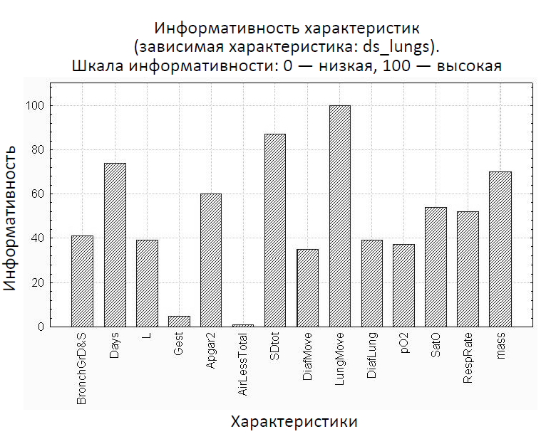 Рис. 2. Информативность характеристик, использованных для классификации детей раннего возраста с поражением легких без выполнения рентгенографии. Обозначения: BronchGrD&S — наличие бронхограммы в консолидированной легочной ткани на сонограмме (бинарная экспертная оценка), days — день жизни в момент обследования, L — длина тела при рождении (см), gest — срок гестации при рождении (недели), Apgar 2 — оценка Апгар на 5-й минуте (баллы), AirLessTotal — суммарная площадь консолидированных участков легких на сонограмме (мм2), SDtot — суммарное по полям легких сонограммы количество B-линий (штуки), DiafMove — амплитуда движения диафрагмы (мм), LungMove — амплитуда движения легких (мм), DiafLung — отношение амплитуд движения диафрагмы и легких (единицы), pO2 — напряжение кислорода в крови (мм Hg), SatO — сатурация кислорода (%), RespRate — частота дыханий (1/мин), mass — масса тела в день обследования