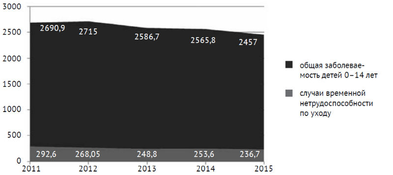 При сравнении темпов снижения показателей общей заболеваемости детей 0–14 лет и временной нетрудоспособности по уходу за больным ребенком получены следующие результаты. В то время как общая заболеваемость снизилась за анализируемый период на 8,6 %, число случаев ухода с листком нетрудоспособности за данным контингентом детей за тот же период снизилось на 19,1 %. Так, в 2011 г. показатель составил 292,6, а в 2015 г. — 236,7 на 1000 соответствующего населения.