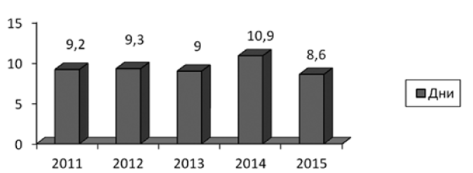Также нами определена длительность одного случая ухода за больным ребенком. За период исследования продолжительность одного случая временной нетрудоспособности по уходу колебалась от 8,6 дня в 2015 г. до 10,9 в 2014 г. (рис. 2).