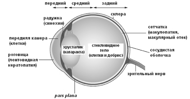 Рис. 1. Схематическое изображение глаза с указанием структур, поражаемых при переднем, среднем и заднем увеите. В скобках приведены симптомы поражения