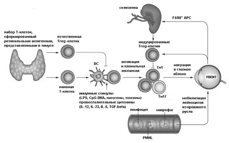 Активность этих провоспалительных T-клеток управляется CD4+, CD25+, FoxP3+, T-регуляторными клетками, в том числе и индуцируемыми. Патогенетическая роль как Т-хелперных клеток 1-го и 17-го типов, так и регуляторных Т-клеток при неинфекционном увеите установлена в ходе экспериметальных и клинических исследований, однако детальные механизмы участия каждого из этих звеньев в формировании заболевания неизвестны [2, 47, 71, 80].