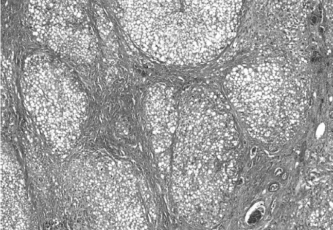 Рис. 3. Цирроз печени с формированием ложных долек, состоящих из гепатоцитов в состоянии выраженной жировой и белковой дистрофии (окраска гематоксилином и эозином, ув. ×100)