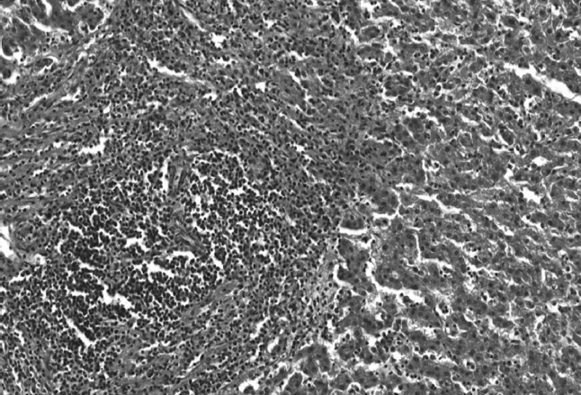 В отдельных полях зрения отмечалась пролиферация желчных протоков с явлениями холестаза. На большем исследуемом протяжении в строме расширенных склерозированных портальных трактов, а также в фиброзных септах определялась диффузная, местами очаговая воспалительная инфильтрация, состоящая преимущественно из лимфоцитов и макрофагов с примесью лейкоцитов (рис. 4).