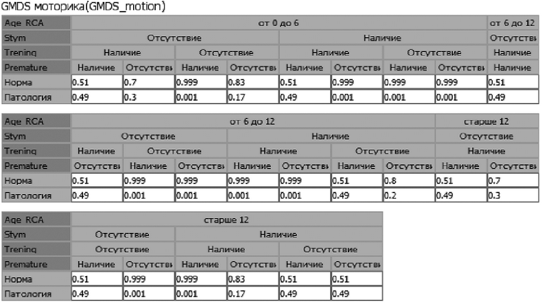Рис. 2. Фрагмент таблицы априорных вероятностей моторных навыков испытуемых по шкале интеллектуального развития по GMDS