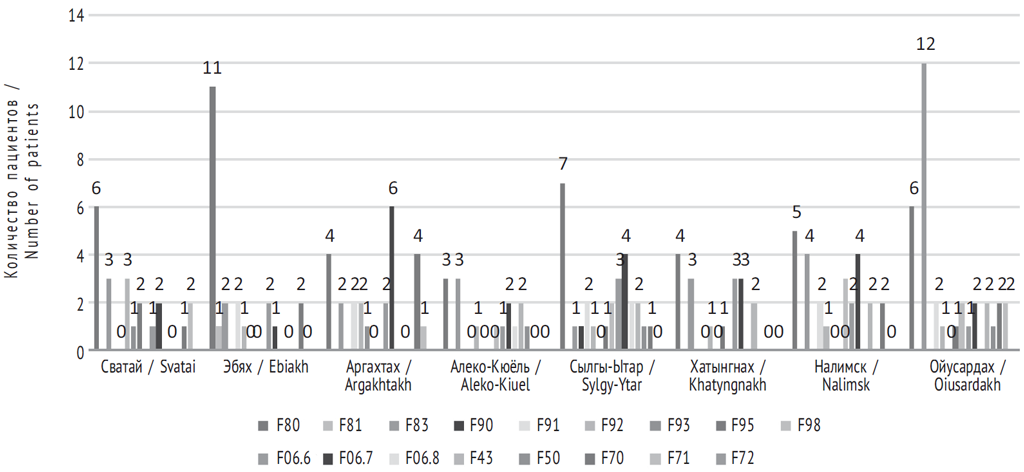 Профиль психических расстройств во всех населенных пунктах был представлен достаточно равномерно. Обращает на себя внимание большой удельный вес речевых расстройств в п. Эбях — 11 человек, что составляет 23,9 % случаев всех выявленных речевых расстройств в обследованном регионе. В п. Ойусардах количество пациентов с задержками психического развития (12 чел.) составило 40,0 % всех диагностируемых случаев данной патологии. Относительно высокое распространение речевых расстройств в п. Эбях предположительно связано с высоким процентом семей с неблагополучным алкогольным анамнезом. Чаще расстройство рецептивной речи выявлялось у мальчиков до 7 лет (χ² = 5,56, р = 0,018).