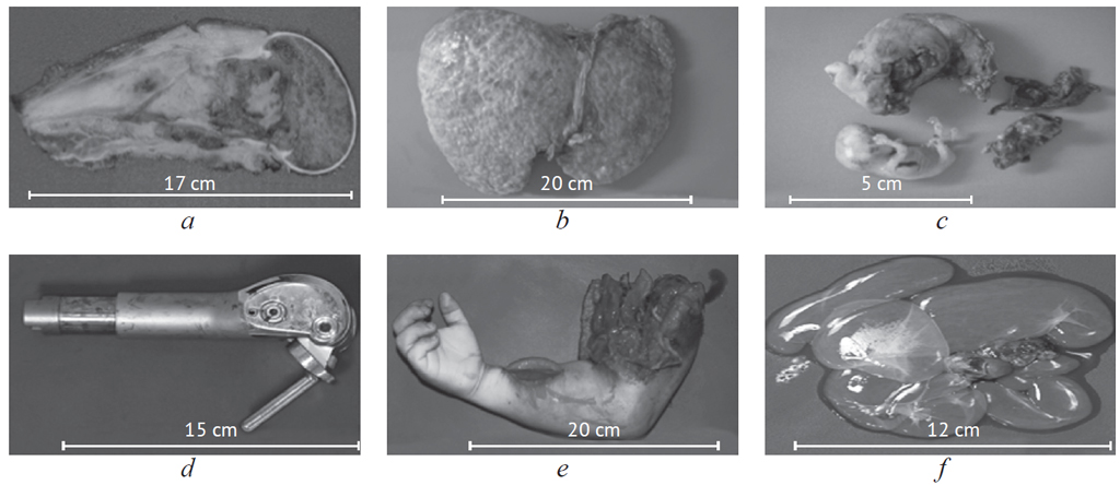 5) Gross specimens of cases (Fig. 1, e) that may be the cause of court proceedings (foreign bodies, traumatic organ amputations); unusual findings (Fig. 1, f) and rare cases (mesothelial, fetus in fetu, others).