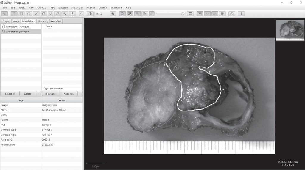 Рис. 2. Пример работы с программным обеспечением QuPath для аннотации цифрового изображения макропрепарата опухоли щитовидной железы