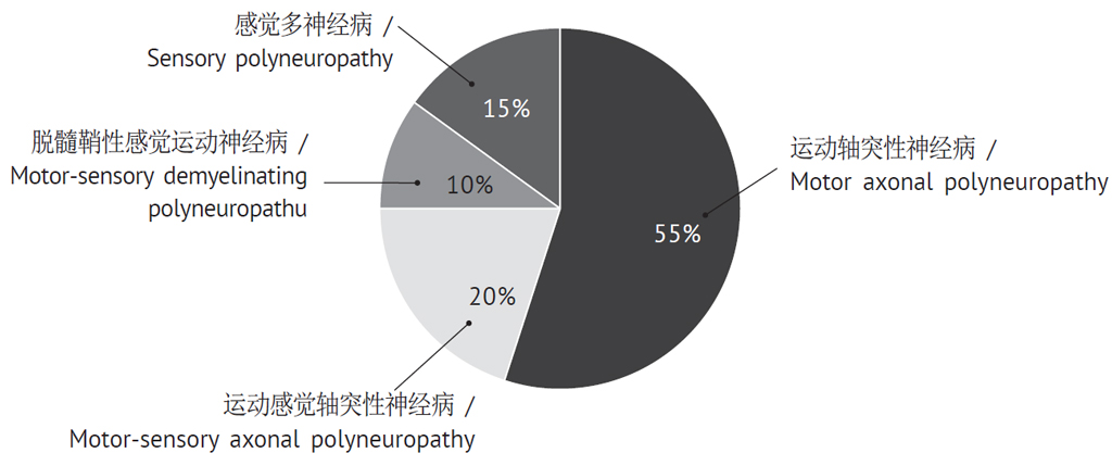 Рисунок. Распределение полиневропатий по типам поражения нервных волокон и характеру изменений периферических нервов у детей с острым лимфобластным лейкозом по результатам электронейромиографии на этапе индукционной химиотерапии