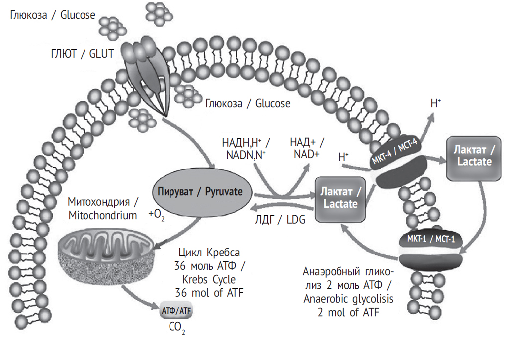Рис. 1. Метаболизм глюкозы до лактата [8]. Здесь и на рис. 2–4: НАД — никотинамидадениндинуклеотид, ЛДГ — лактатдегидрогеназа, МКТ — монокарбоксильный транспортер, АТФ — аденозинтрифосфат