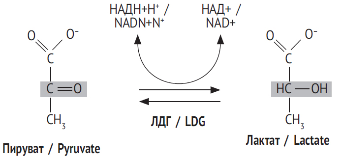 При гипоксии пируват не поступает в митохондрии, а превращается в лактат с участием фермента лактатдегидрогеназы (ЛДГ) [4]. Эта реакция обратима (рис. 2).