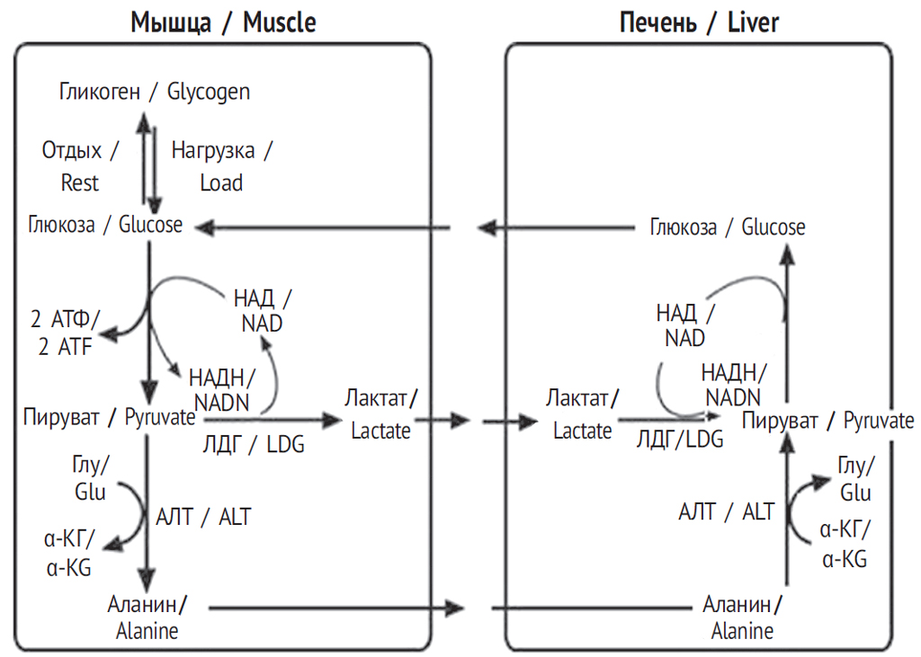 Лактат является и промежуточным продуктом внемитохондриального окисления жирных кислот и необходим для синтеза некоторых заменимых аминокислот (аланин, глицин, серин и др.). Аланин синтезируется в мышечной ткани из молочной кислоты, а далее легко превращается в печени в глюкозу. Этот процесс носит название глюкозо-аланинового цикла (рис. 3) и служит одним из основных путей глюконеогенеза в печени [3].