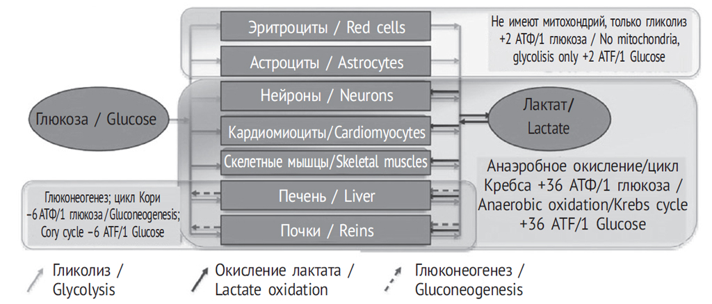 Глюкоза и лактат связаны через гликолиз и глюконеогенез. Глюконеогенез осуществляется в печени и почках, конвертируя циркулирующий лактат в пируват, а далее в глюкозу. Лактат, образовавшийся в интенсивно работающих мышцах и в клетках с преобладающим анаэробным способом катаболизма глюкозы, поступает в кровь, а затем в печень. Далее образовавшийся пируват включается в глюконеогенез, а образовавшаяся глюкоза поступает в кровь и поглощается скелетными мышцами. Эту последовательность событий называют «глюкозо-лактатным циклом» или «циклом Кори» [3, 4, 9] (рис. 5).